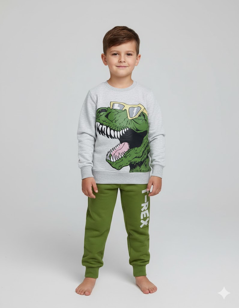 The light grey sweatshirt features a striking oversized T-Rex print wearing cool sunglasses, giving the outfit a unique and modern edge. Paired with green jogger pants printed with a bold “T-REX” graphic down the leg, this set adds excitement to your child’s wardrobe while ensuring maximum comfort.